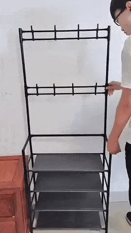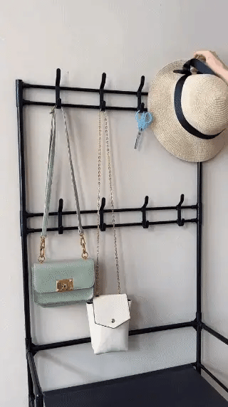 Este perchero con zapatera integrada combina funcionalidad y diseño moderno en una sola estructura resistente. Ideal para entradas, dormitorios o departamentos pequeños.